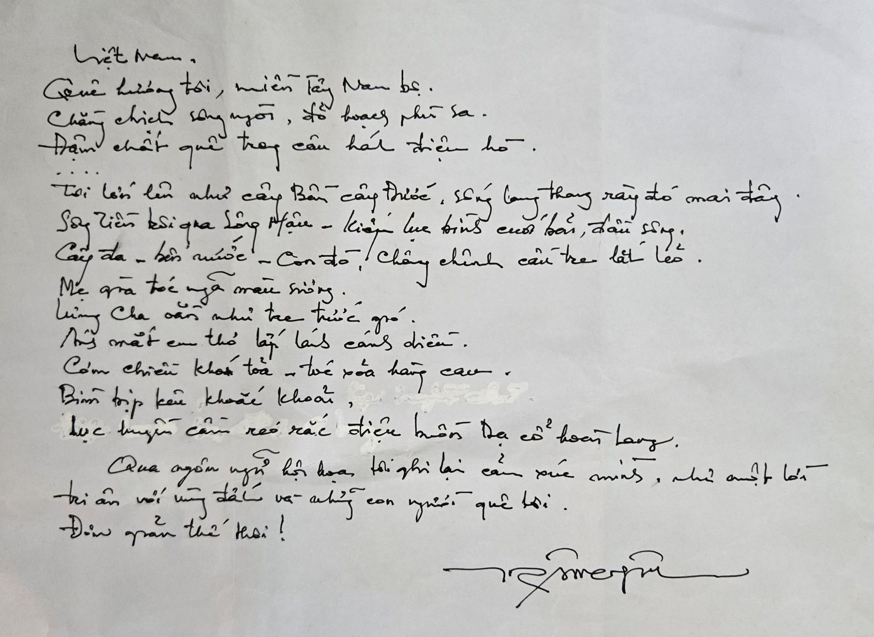 Việt Nam Quê hương tôi, miền Tây - Nam bộ, Chẳng chịch sông ngòi, đỏ hoạch phù sa. Đậm chất quê trong câu hát điệu hò. Tôi lớn lên như cây Bần cây Đước, sống lang thang rày đó mai đây. Sông Tiền trôi qua sông Hậu – kiếp lục bình cuối bãi, đầu sông. Cây đa – bến nước – con đò! Chông chênh cầu tre l...Read more